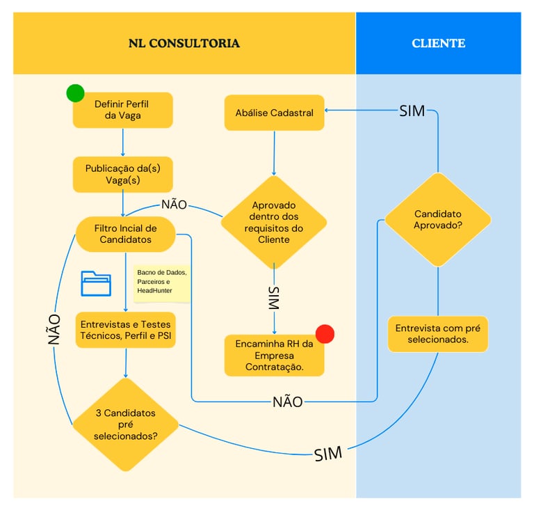 Caso nenhum candidato seja aprovado, o processo retorna para a NL Consultoria, que reinicia o ciclo de busca com novos perfis, garantindo assertividade e agilidade na contratação.